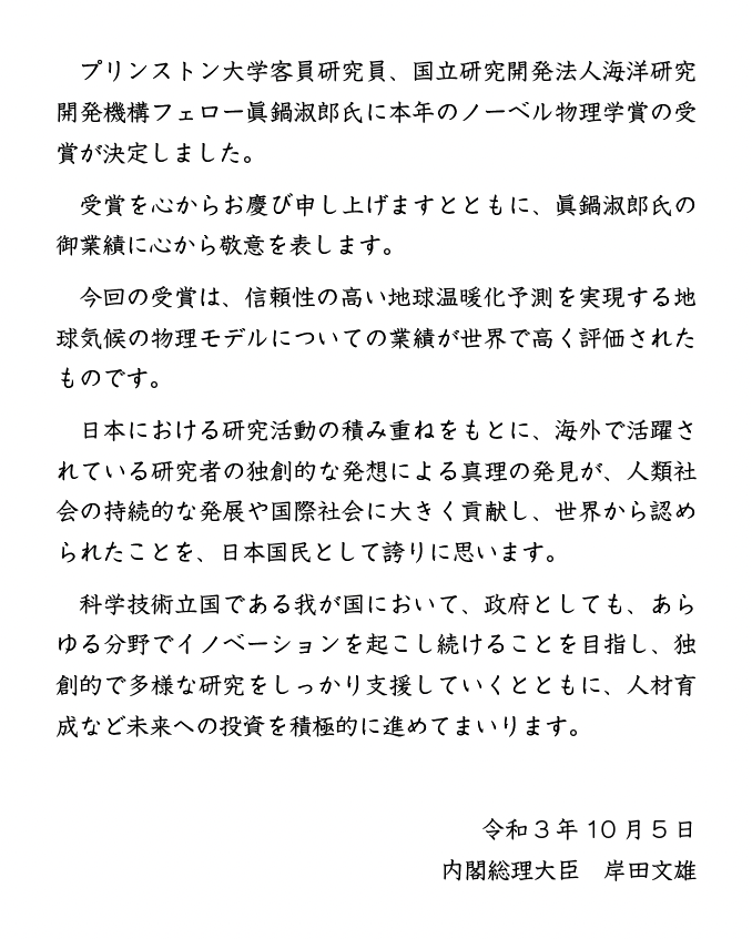 岸田文雄総理 眞鍋淑郎氏のノーベル物理学賞の受賞に関し 日本国民として誇りに思います Togetter